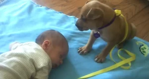 Moeder legt ontroerende reactie van puppy naast slapende baby vast
