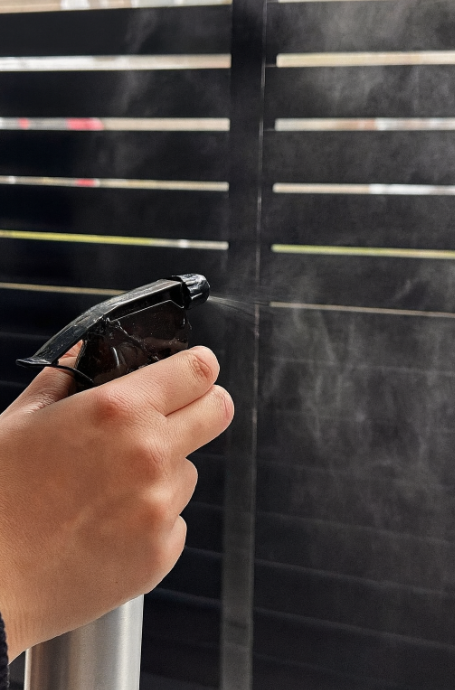 Vernevel het mengsel daarna heel licht over je lamellen — niet doorweken, een subtiele mist is genoeg. Kort laten drogen en klaar: lamellen die langer stof afstoten en ook nog eens heerlijk geuren.