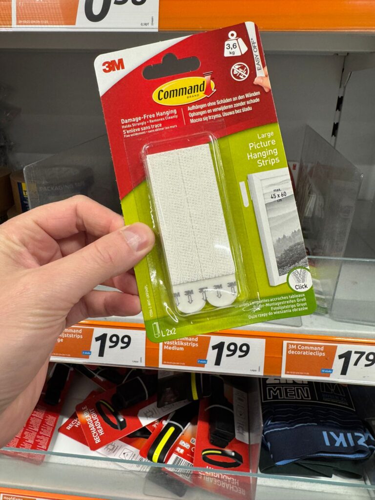 Je vindt deze superhandige 3M Command strips bij Action voor maar €1,99. Even binnenlopen en je kunt direct aan de slag. Geen boor, geen gedoe – wél een strak resultaat aan de muur.