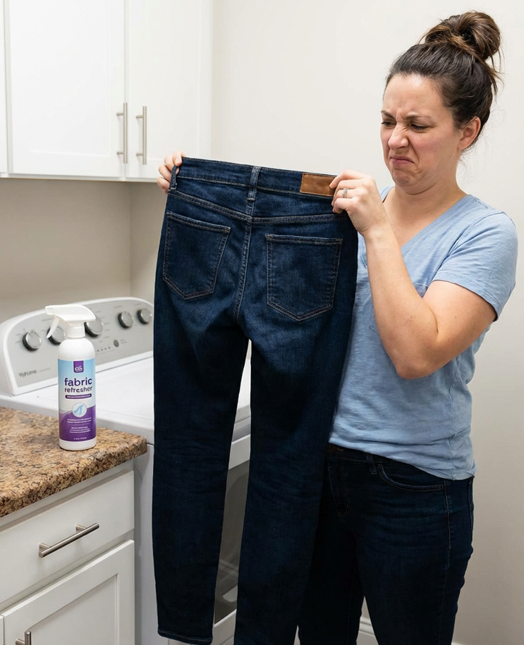 Moet je snel iets opfrissen? Een textielspray kan tijdelijk helpen. Vernevel lichtjes aan de binnenkant van het kruis en laat goed drogen. Handig als noodoplossing, maar wassen blijft de beste aanpak.