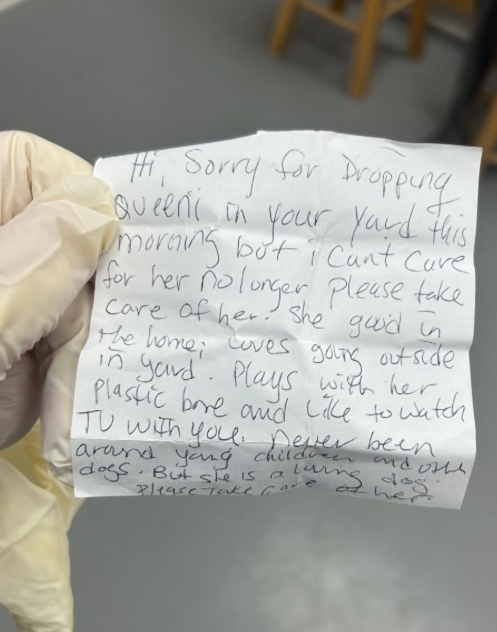 Op het met de hand geschreven briefje stond dat haar eigenaar niet langer voor haar kon zorgen. Geen harde woorden, geen verwijten—alleen een eerlijke, emotionele uitleg en zorg om haar toekomst. Tussen de regels door las je liefde, maar ook de pijn van iemand die geen uitweg meer zag.