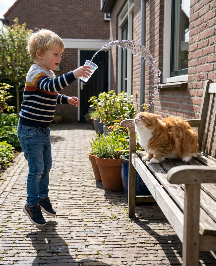 Niemand was blij met een natte kat, en uiteindelijk liep het tussen de buren goed af. Het herinnert je eraan hoe belangrijk het is om respect voor dieren vroeg aan te leren — en hoe snel emoties kunnen oplopen als een huisdier betrokken is. Hopelijk heeft de jongen hier iets van geleerd waar hij en zijn omgeving later wat aan hebben.