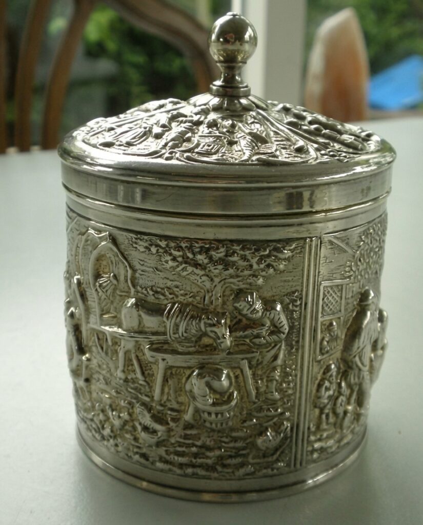 Zo’n theebus gebruikte je om losse thee in te bewaren. Toen theezakjes nog lang niet overal de norm waren, kochten mensen vaak losse thee. Die moest je goed afsluiten zodat smaak en geur niet verloren gingen.