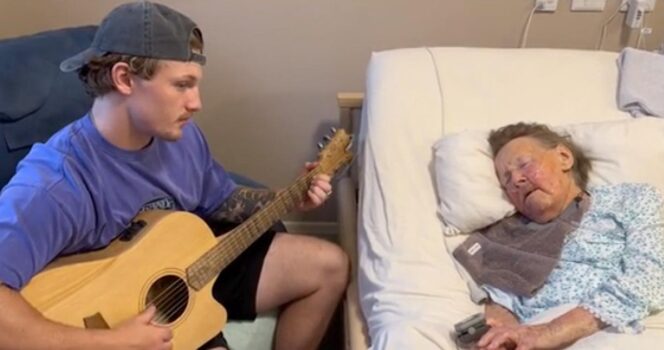 Liggend op haar sterfbed had ze één wens: haar achterkleinzoon nog één keer horen zingen. Ethan, die al zijn hele leven met muziek bezig is, twijfelde geen moment. Met zijn gitaar liep hij de ziekenhuiskamer binnen, schoof dicht naast haar en liet de eerste rustige akkoorden horen. Die kleine, intieme, onvergetelijke scène werd vastgelegd op video, zodat de familie — en later ook veel anderen — het mee kon beleven.