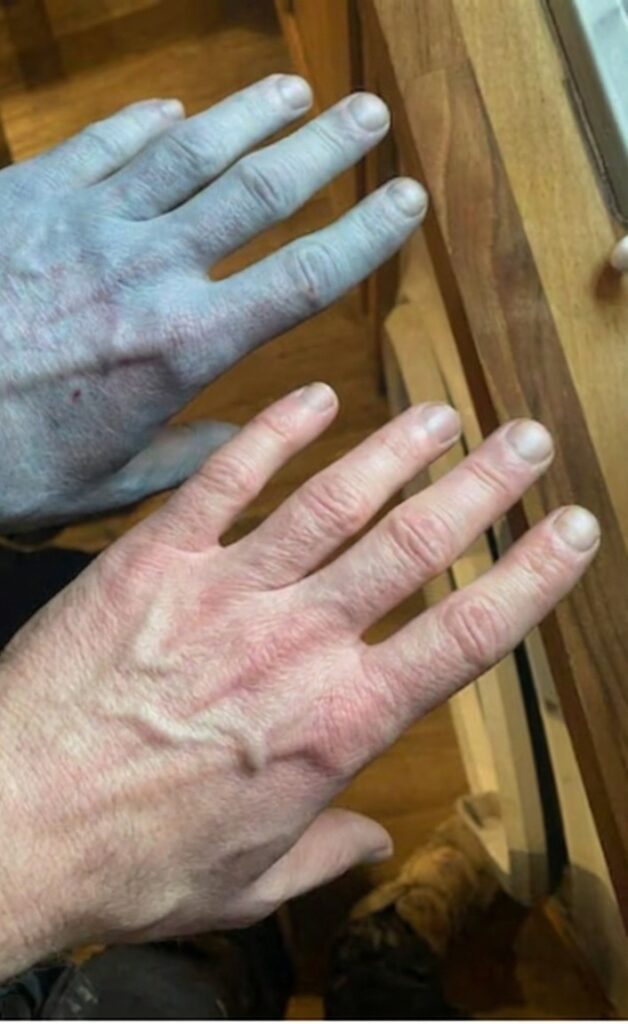 Niet alleen zijn handen pakten kleur; ook zijn armen, borst en romp waren duidelijk blauw uitgeslagen. Als het lokaal blijft, is er soms nog een logische verklaring. Maar als grote stukken huid meedoen, gaat het ziekenhuis vol in onderzoeksstand.