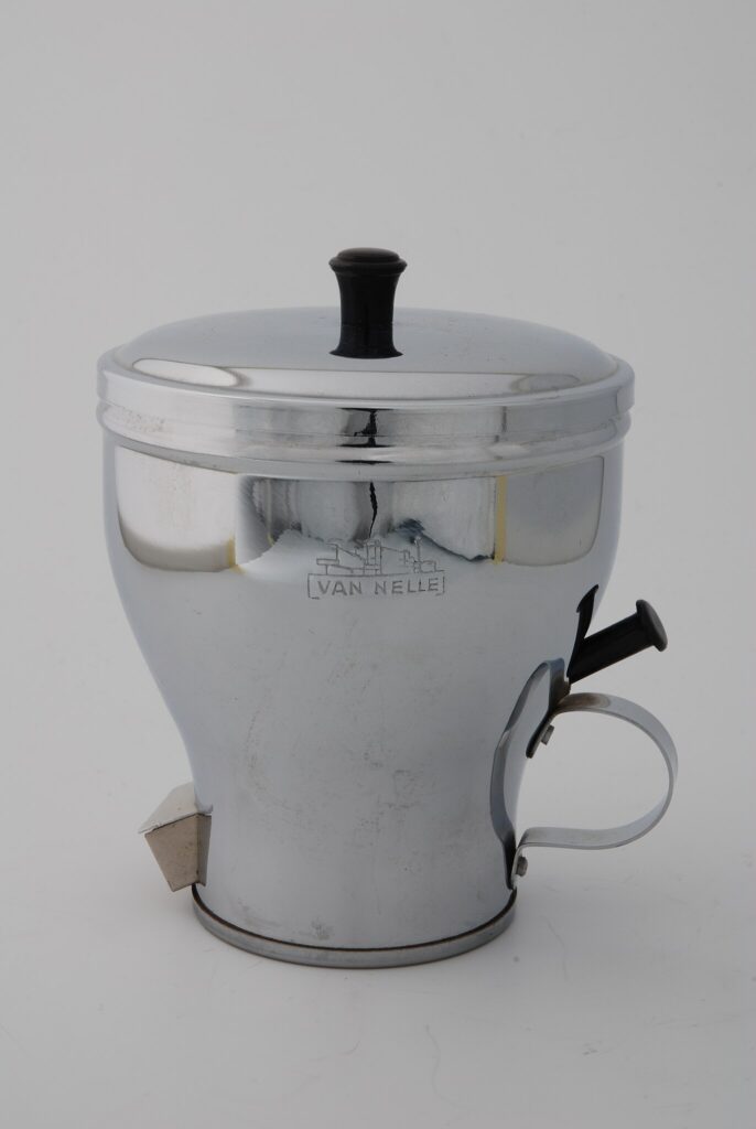 Je zou het kunnen aanzien voor een mini-pannetje of een keukendoosje om iets in te bewaren. Maar als je beter kijkt, valt het kwartje: dit stond vroeger vaak op tafel bij koffie of thee.