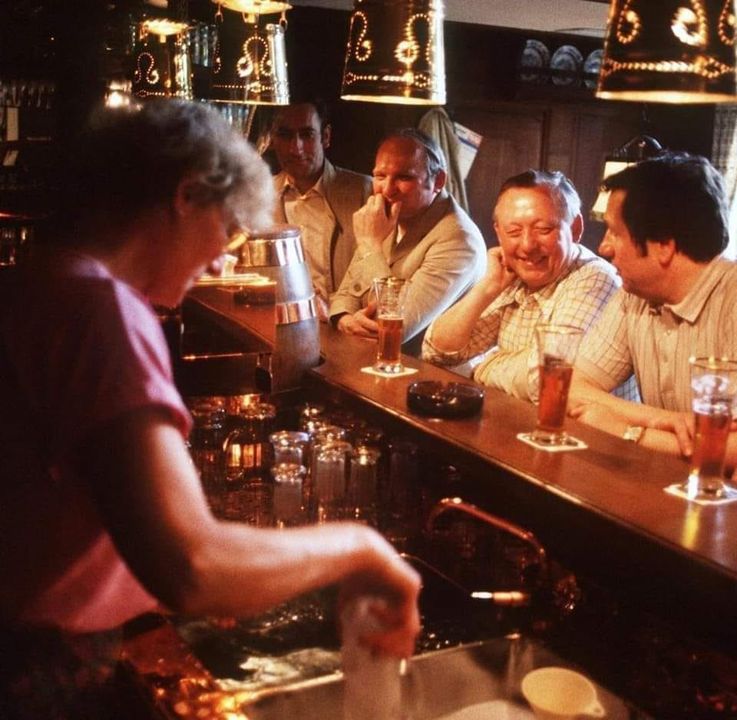 Precies! Je ziet hier iets wat je tegenwoordig bijna niet meer tegenkomt: échte, volle aandacht. Geen schermpjes, geen oortjes, niemand die wegkijkt om gauw een appje te tikken. Gewoon mannen aan de bar, pratend, lachend, misschien wat mopperend — maar vooral samen.