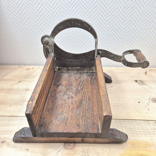 De Raadvad broodsnijmachine staat op een solide houten plankje waar je het brood op legt. Aan de zijkant zit een grote, ronde beugel met een scherp mes dat je met een vloeiende beweging door het brood haalt.