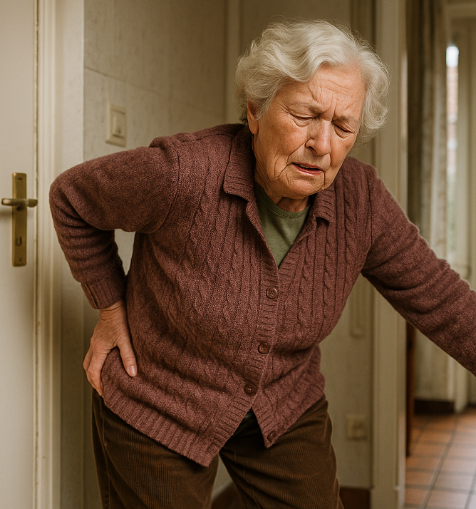 - Moeite en pijn bij bukken of hurken, bijvoorbeeld veters strikken