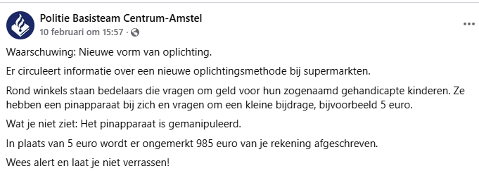 Het basisteam Centrum-Amstel meldde op Facebook dat er recent meerdere incidenten zijn geweest waarbij een zogenaamde “kleine” gift stilletjes veranderde in een bedrag van bijna vier cijfers. Hun tip: blijf rustig, laat je niet opjagen en controleer altijd het totaal voordat je je pincode intoetst of contactloos afrondt.