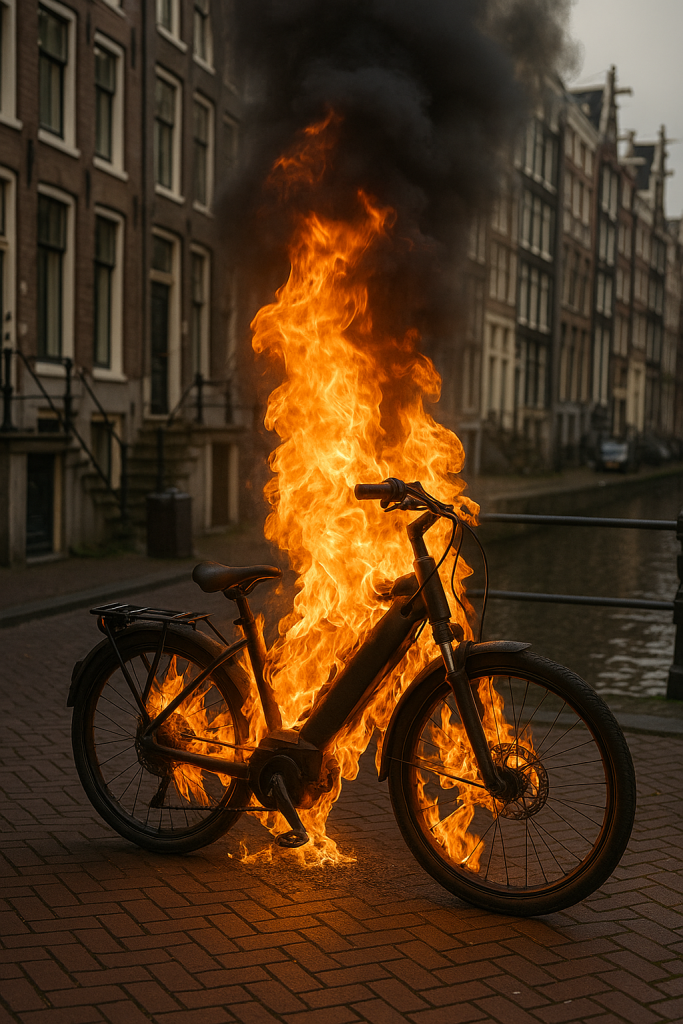 Nog een incident, dit keer met inwoner Henk Smits uit dezelfde plaats, liep eveneens uit de hand. Hij reed op de e-bike van zijn vrouw richting zijn werk in Nijmegen toen de accu plots ontplofte en meteen vlam vatte. Hij vertelt: “Voor ik doorhad wat er gebeurde, sloegen er grote vlammen uit de accu. Geen kleine vonkjes, maar serieuze vuurstralen. Gelukkig kon ik nog van de fiets afkomen. Mijn werkkleding was deels gesmolten en mijn broodjes waren gewoon geroosterd.”