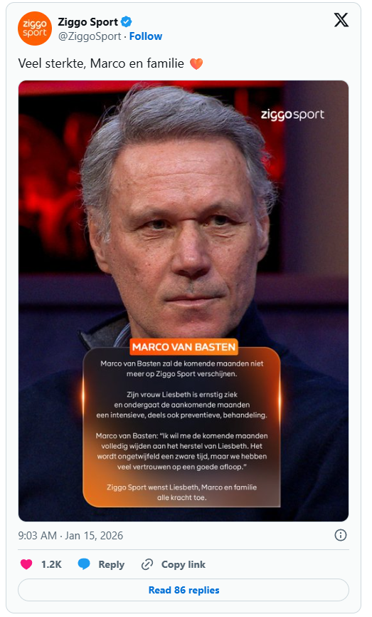 In een officiële verklaring laat Ziggo Sport weten dat Van Basten voorlopig niet aanschuift bij zijn vaste programma’s en ook geen wedstrijden meer zal analyseren. De reden is persoonlijk en ingrijpend: Liesbeth begint aan een intensief behandeltraject dat de komende maanden veel van haar en het gezin vraagt.
