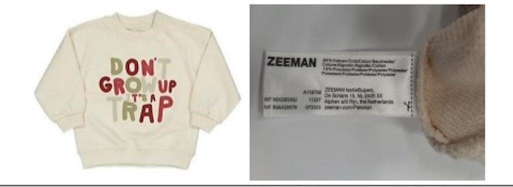 Zeeman vraagt klanten dringend om een bepaalde babytrui meteen niet meer aan te trekken en zo snel mogelijk in te leveren. Het gaat om een sweater met de tekst “don’t grow up, it’s a trap”. Bij sommige exemplaren kunnen delen van de print loskomen, wat risico’s oplevert voor jonge kinderen.
