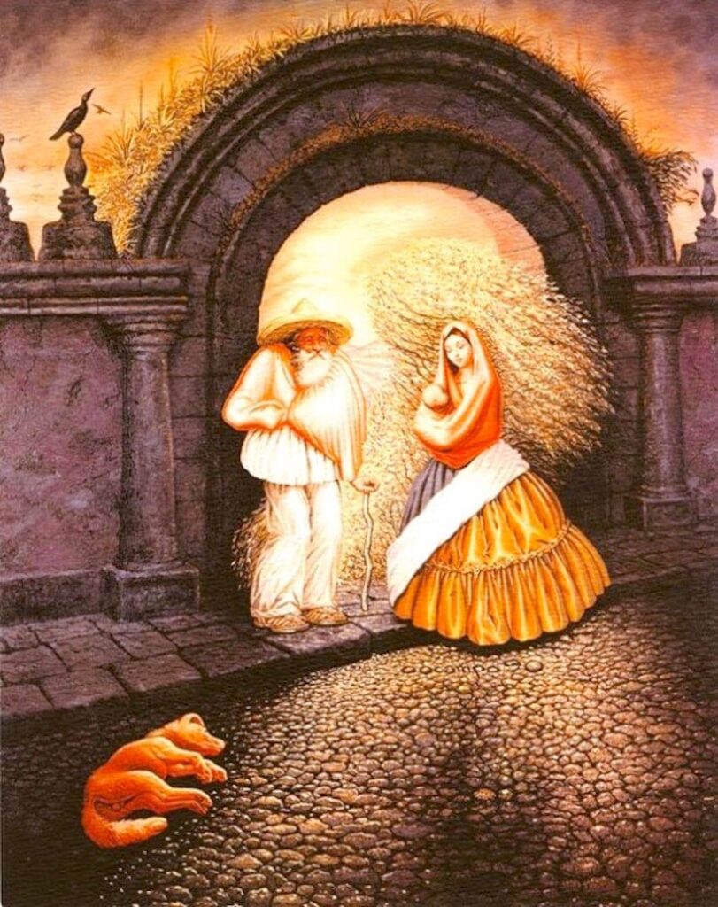 Er is nog een speels extraatje. Sommige mensen tellen ook de hond die ergens in de compositie snuffelt. Dan kom je royaal op tien “gezichten” — een beetje smokkelen, natuurlijk. Toch is het leuk hoe Ocampo met vormen speelt, waardoor je denkt: hé, dat lijkt óók een snuit… of is het gewoon steen en schaduw?