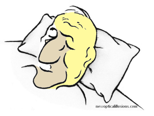 De slapende vrouw zit er echt in. Haar gezicht valt minder op, maar als je goed kijkt, zie je dat de neus van de man eigenlijk de linkerwang en kin van de slapende vrouw vormen.