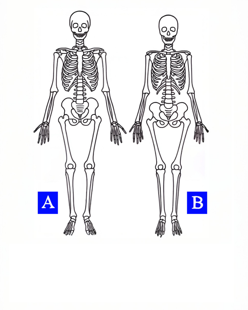Stel dat je een illustratie ziet met twee skeletten, A en B. Op het eerste gezicht lijken ze precies hetzelfde: dezelfde houding, vergelijkbare botten, niets opvallends. Maar er is één onderdeel dat bijna altijd de doorslag geeft. Dus: welke van de twee is vrouwelijk?